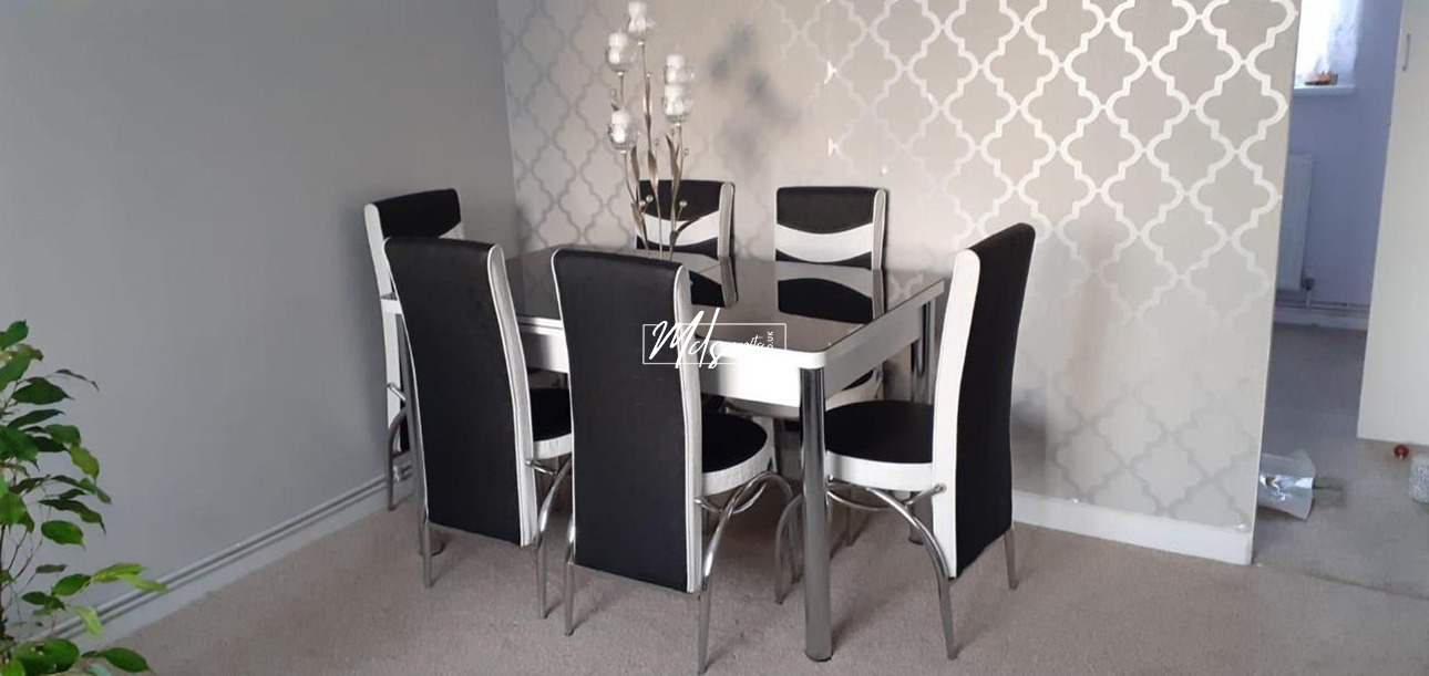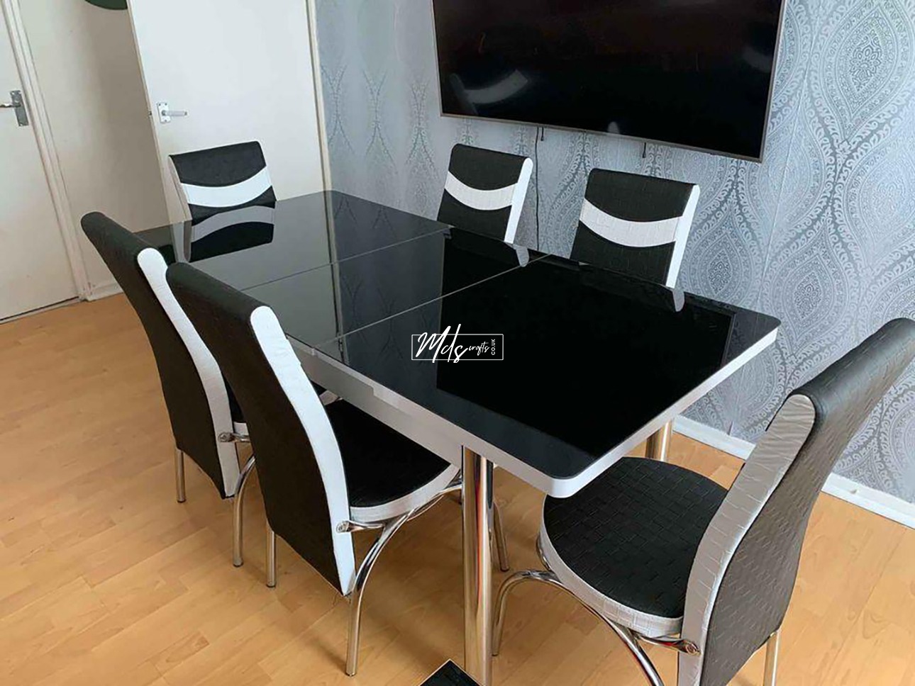 Introducing our exquisite Black & White Turkish Style Dining Table & Chair set, a fusion of elegance and functionality designed to elevate your dining experience. Crafted with meticulous attention to detail, this table boasts a height of 80cm, a length of 130cm (extendable up to 170cm), and a depth of 82cm, providing ample space for intimate gatherings or lavish feasts. Its sleek tempered glass top, measuring 130cm in length and 82cm in depth, exudes modern sophistication, supported by stylish chrome legs that add a touch of opulence to any dining space. Available in a myriad of captivating designs, and with the option of 6 or 4 chairs, this set promises to be the centerpiece of your home, where every meal becomes a moment of indulgence and delight.