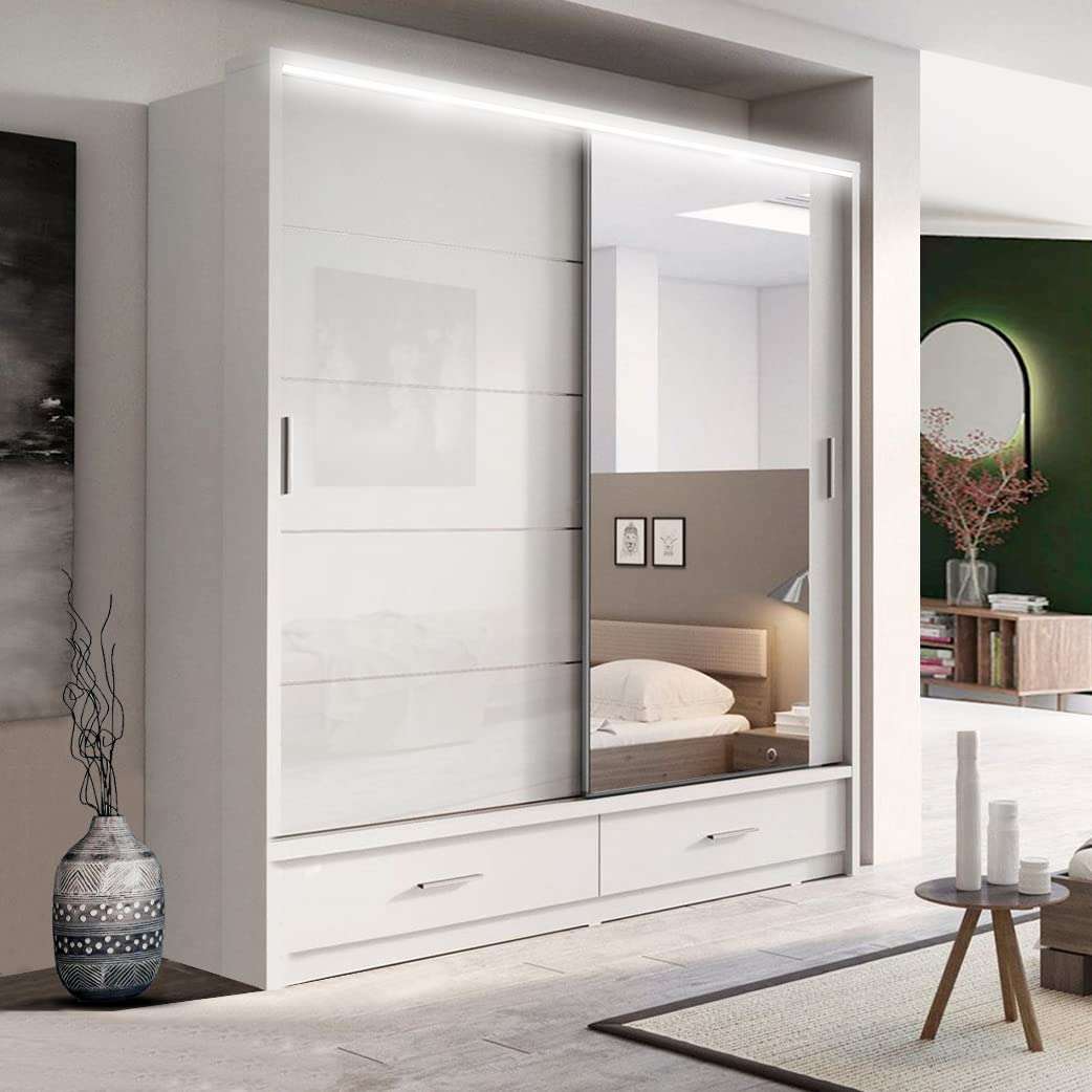 This wardrobe is designed for maximum organization with ample hanging space for clothes and extra shelves for folded items, shoes, and accessories. The sliding doors ensure smooth access to your items while saving space, and the wardrobe is available in 203cm and 256cm sizes to suit both medium and large rooms.